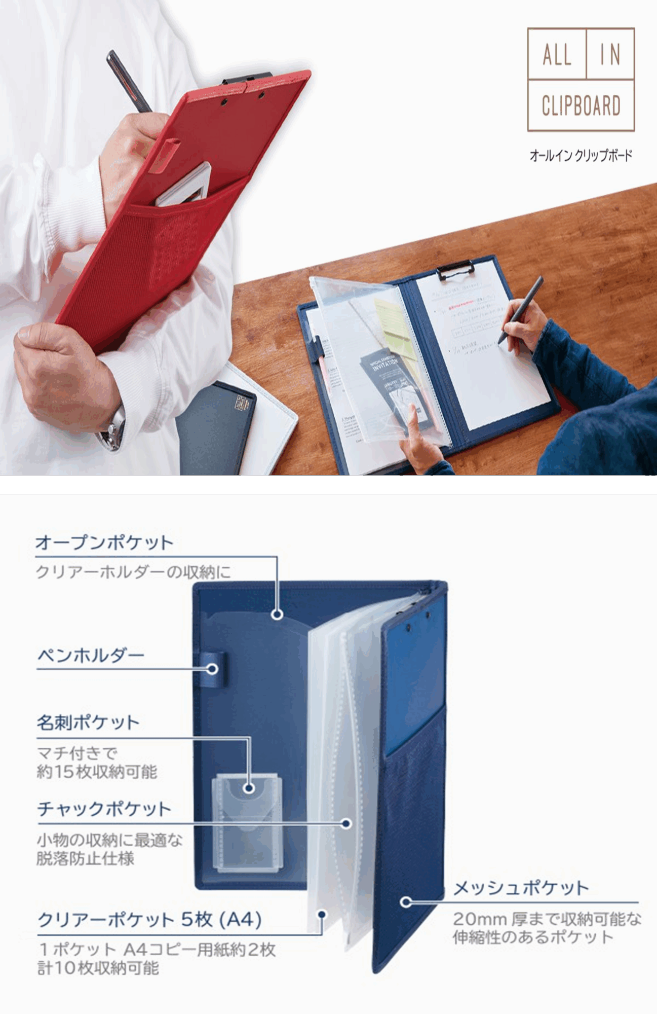 多機能ポケットが小物と書類の持ち運びに便利なクリップボードです。